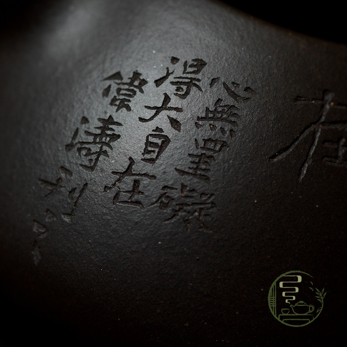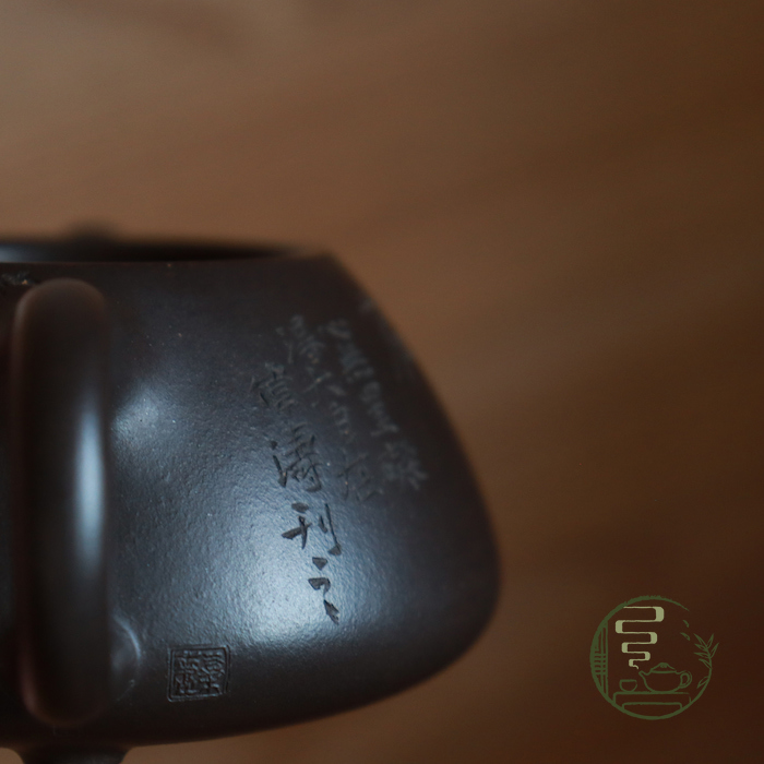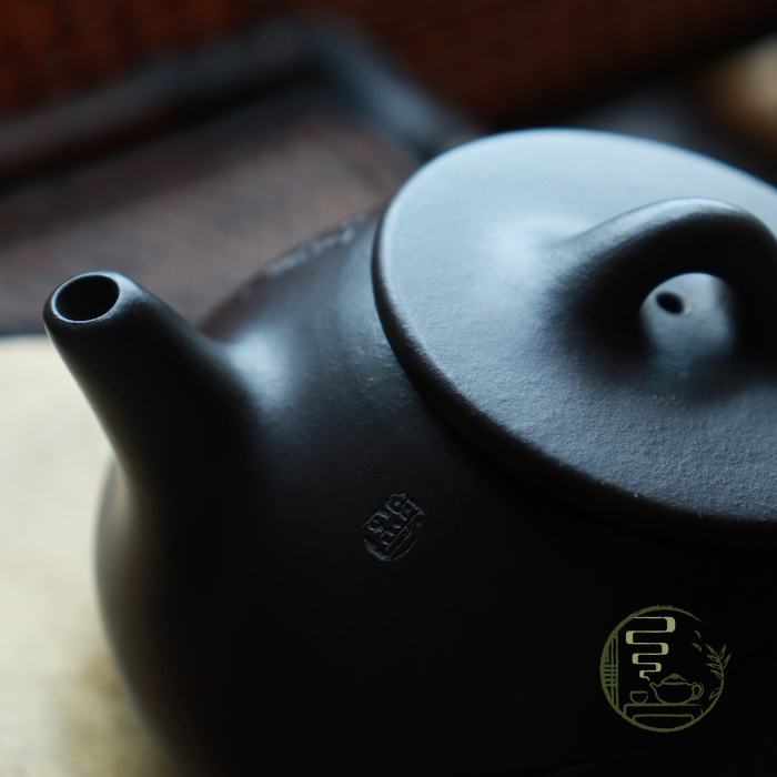 Ấm trà này có phần trên nhỏ, phần dưới lớn, trọng tâm thấp, tạo nên hình dáng đơn giản, chắc chắn và hài hòa. Mặt trong thân ấm lưu lại "vân chiếu” một loại hoa văn trang trí cổ xưa vốn thường xuất hiện trên đồ gốm thời tiền Tần. "Vân chiếu" vượt qua không gian lịch sử, được khéo léo đưa vào trong nghệ thuật chế tác tử sa, trở thành điểm nhấn tinh tế vừa mang tính thủ công, vừa giàu giá trị biểu tượng. Miệng ấm tròn đều, ấm nung hoàn chỉnh chỉ trong một lần, thể hiện độ chính xác và sự thành thục trong kỹ pháp. Một dấu triện nhỏ nơi thân, như lời xác tín lặng lẽ mà tự tin của người nghệ nhân - khi tâm đã rõ, hình tự thành.